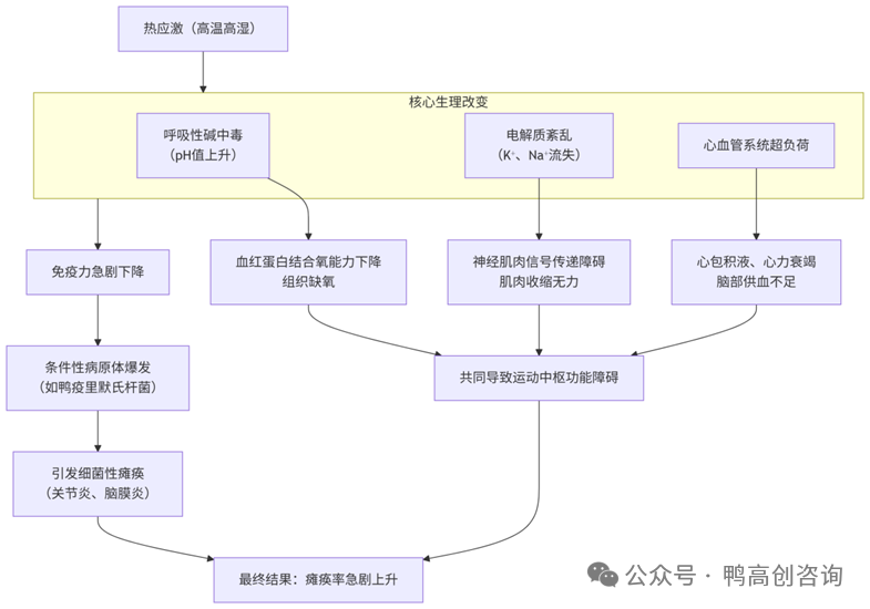 因此在高温高湿的夏季,雨后突晴的天气最容易诱发肉鸭瘫痪,此时地面水分蒸发形成“蒸腾效应”,而肉鸭又缺乏有效的散热方式,使得体感温度急剧升高。热应激导致肉鸭瘫痪数量增多,而是高温高湿超越了肉鸭生理调节的极限,造成了生理失代偿,引起呼吸性碱中毒,电解质紊乱,心血管系统超负荷,并最终导致多器官系统连锁崩溃及紊乱,运动中枢功能障碍,瘫痪率急剧上升。