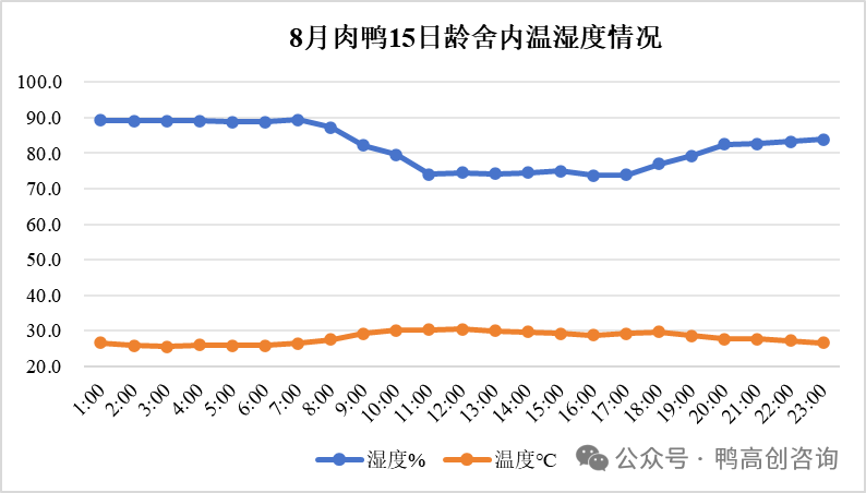 很多疾病都会导致肉鸭瘫痪,病毒性疫病如鸭瘟、鸭病毒性肝炎、鸭坦布苏病毒、鸭细小病毒、呼肠孤病毒等都有此临床症状;细菌性疫病如鸭疫里默氏杆菌、链球菌、葡萄球菌、大肠杆菌及沙门氏菌等也会造成瘫痪。夏季高温高湿的环境,如下图,15日龄肉鸭,棚舍内温度最高30.4℃,最低25.6℃,从中午10点到下午16点棚舍内温度一直维持在30℃左右,此时棚舍内湿度可达75%左右,为病原微生物的繁殖提供了理想的条件。其中肉鸭传染性浆膜炎在夏季的发病率明显升高,病鸭会表现为精神沉郁、咳嗽、眼鼻分泌物增多,瘫痪肉鸭比例增多。因此在发现棚舍内瘫痪肉鸭增多的现象时,需要首先排除传染性疾病的发生,尤其是鸭疫里模式杆菌的感染。笔者了解到近期20日龄之前淘汰鸭较多的养殖场,剖检后未见明显异常,只出现轻微的心包积液和脑膜出血的现象,而且送检后未检出常见的病原微生物,因此主要还是考虑夏季高温高湿造成的热应激,使得瘫痪肉鸭增多。