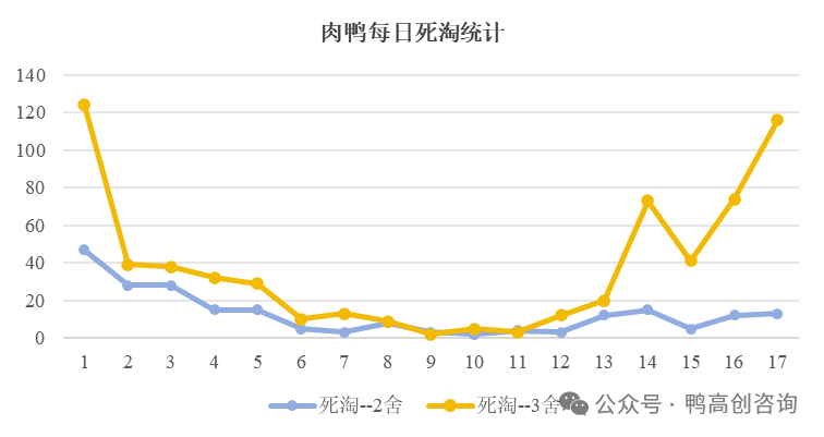 体温调节能力缺陷:研究发现,高温环境孵化的雏鸭,其下丘脑体温调节中枢的发育程度显著低于正常雏鸭。这使得它们在后期的热应激耐受能力降低,在同样的高温环境下,死淘率比正常雏鸭高25%-30%。笔者在养殖场发现,同一个饲养员,同样的规模化笼养的条件,但是2舍和3舍鸭苗厂家不同。3舍从进场后鸭苗死淘较多,然后7日龄分群后死淘趋于正常;但是从12日龄开始,淘汰的瘫痪肉鸭增多,持续到17日龄,每日淘汰肉鸭高峰可达到116只,剖检只看到部分肉鸭表现为心包积液和脑膜出血,对于肉鸭养殖产生较大的经济损失。分析2舍和3舍的养殖情况,其差异大概率是鸭苗导致的,高温蛋引起鸭苗整体质量较差,在同样的高温养殖的季节,其耐热性差,更容易出现瘫痪的问题。