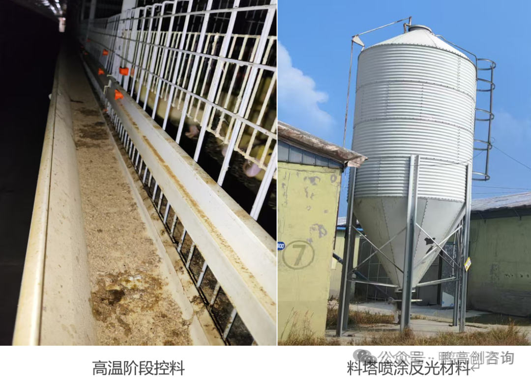 饲料安全管理:料槽每日清空1次防止霉变。储料间温度控制在25℃以下,相对湿度≤65%。对于料塔,可以喷涂反光材料,降低塔内温度。
