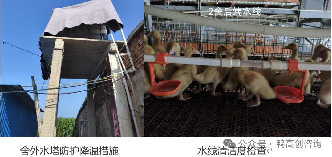 饮水系统升级对缓解热应激至关重要。应确保饮水充足且清凉:按每1000只鸭提供≥15个乳头饮水器或6米水槽的标准配置。对于舍外的供水系统,需要做好防护,防止进舍水温过高;同时需要每日检查水线清洁度,可以使用缓释氯片进行水线的持续消毒,防止生物膜的形成。