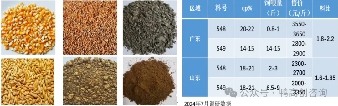 更有趣的是,南方会把548饲料的蛋白含量设计比549饲料还高,代谢能也更高。因为他们不希望鸭子长得太快,羽毛还没长好就出栏——那会严重影响售价。北方则相反,更多追求出栏速度和成本控制,饲料价格不断下探,部分地区吨价甚至低于2000元。