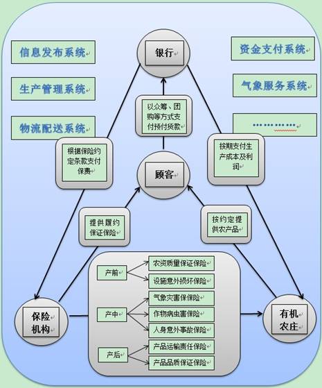 有机农庄通过网站、微博、微信等信息发布系统发布众筹、团购等信息,顾客将预付款通过资金支付系统打入指定账户,并自动获得一份由保险机构提供的诚信履约保障保险,一旦有机农庄不能履约供货,顾客损失由保险机构承担。银行负责按保险机构和有机农庄的约定,按期向保险机构支付保费、向有机农庄支付生产成本和利润。