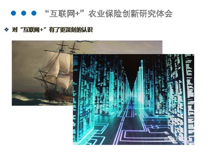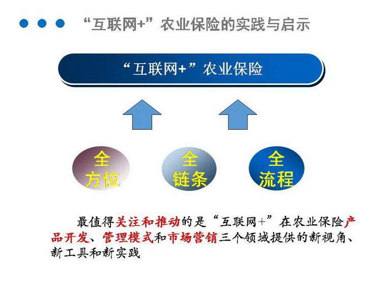 从国内外实践看,“互联网+”农业保险是全方位、全链条,甚至可以说与整个农业保险业务流整体融合的。从国内目前发展来看,最值得关注和推动的是“互联网+”在农业保险产品开发、市场营销和管理模式三个领域提供的新视角、新实践和新工具。