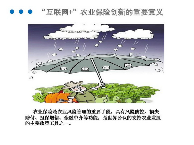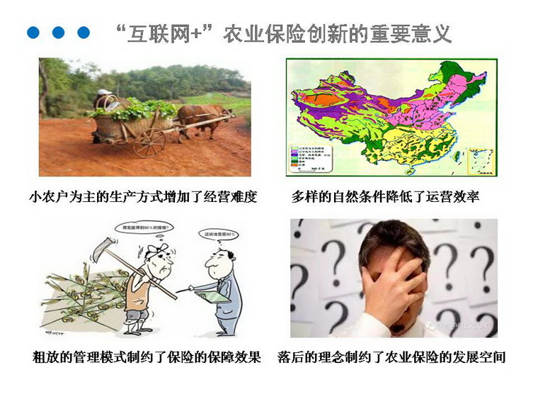 要有效促进我国“互联网+”农业保险发展,首先需认清我国传统农业保险发展中存在的“痛点”,才能对症下药。目前,我国农业保险主要面临以下几方面问题。一是分散的生产方式增加了保险的经营难度。目前我国农业生产经营以小农户为主,生产利润较低,农户投保意愿很弱。在投保农户中,许多只将容易受灾的地块投保,甚至骗保、骗赔的事件也屡有发生,容易造成保险企业亏损。二是多样的自然条件降低了保险的运营效率。我国农业生产地域分布广泛、类型多样,保险公司往往要投入大量的人力、物力组织现场勘查,导致运营成本大幅增加,制约了保险公司开发农业保险的积极性。三是粗放的经营模式影响了保险的保障效果。当前我国农业保险主要以政策性保险为主,保险机构的利润主要源于国家补贴,保费厘定宽泛、产品服务单一、经营管理粗放等问题普遍存在,严重影响了农业保险的保障效果。四是落后的保险理念制约了保险的发展空间。现阶段我国对农业保险的关注点主要集中在经济补偿方面,保险的担保增信、金融中介等功能尚未受到重视,保险作用难以充分发挥,对各方参与农业保险的积极性产生了负面影响。