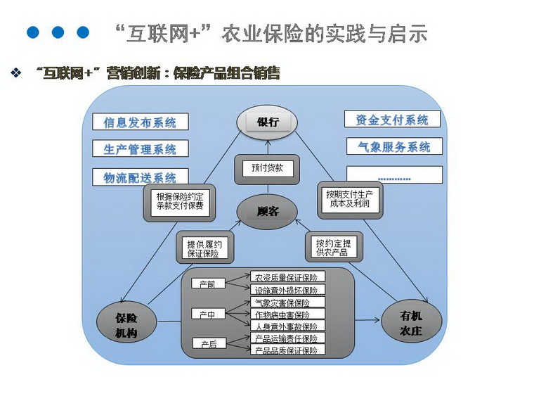 保险产品组合销售是指借助信息发布、资金支付、生产管理、信息服务等平台或系统获取的数据,对农业产前、产中、产后等各个环节的风险进行综合分析、精算、管控,形成由多种保险产品和服务构成的保险解决方案,实现对农业生产经营风险的整体控制,从而稳定农业生产经营收益。