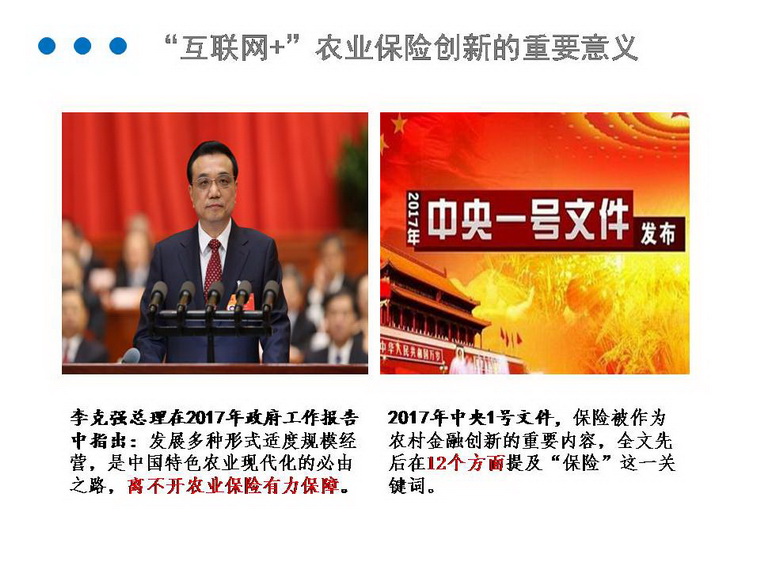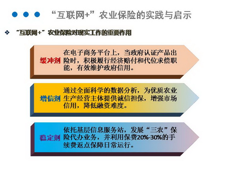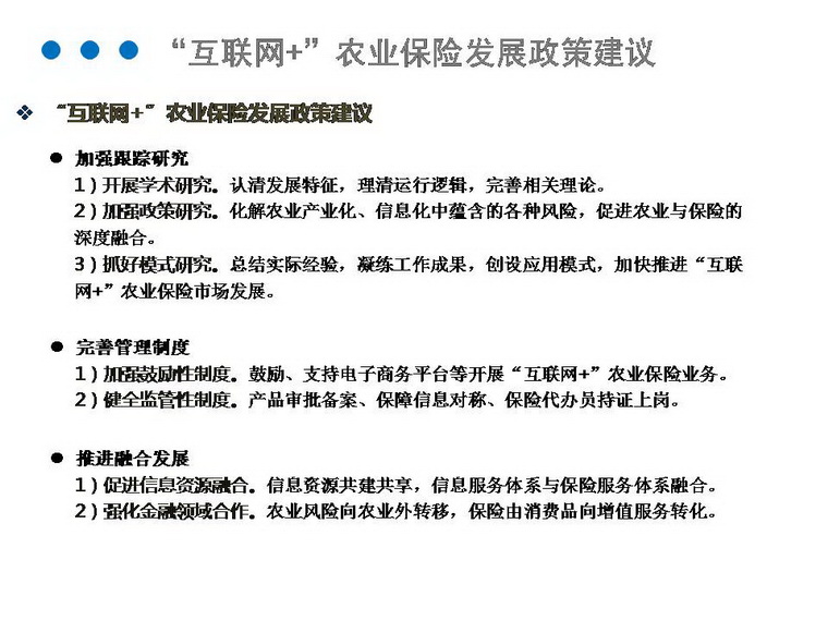 (一)加强跟踪研究。一是开展学术研究。组织相关专家、学者定期开展研讨交流,进一步认清“互联网+”农业保险的发展特征,理清运行逻辑,完善相关理论,为实际应用提供稳固的理论保障;二是加强政策研究。深入研究“互联网+”农业保险发展政策,积极利用保险手段化解农业产业化、信息化中蕴含的各种风险,促进农业与保险的深度融合;三是抓好模式研究。及时跟踪“互联网+”农业保险发展的最新动态,总结实际经验,凝练工作成果,创设应用模式,加快推进“互联网+”农业保险市场发展。