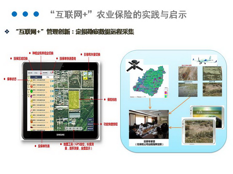 与传统农业保险承保定损方式相比,定损勘察数据远程采集的最大特点是精准化。保费的测算,主要根据现场采集的各类数据,通过与地理信息系统等基础数据的比对确认,依据相应模型和标准进行测算。理赔的核定,主要依靠定损专家团根据远程采集的数据在定损中心完成,有效保证了保险理赔核定的客观、公正。