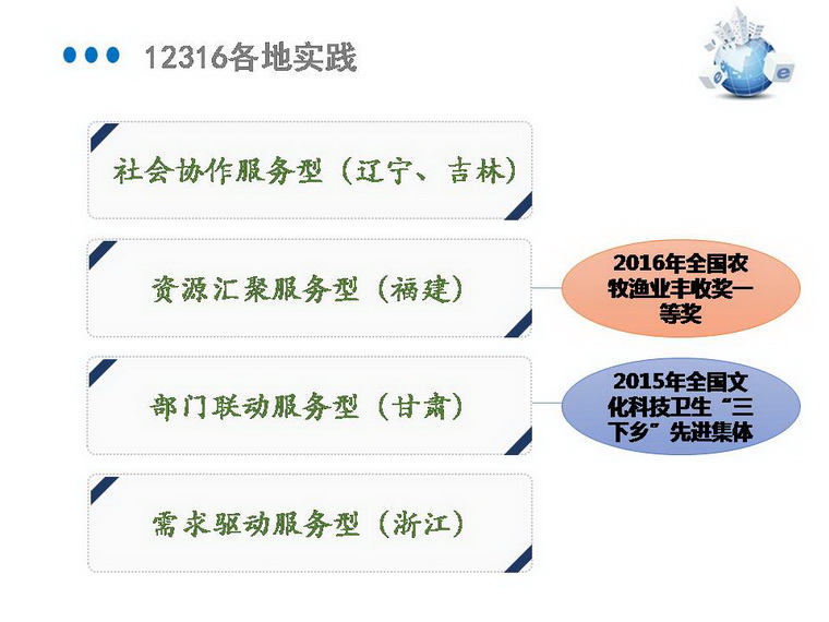 各地在服务“三农”中逐步因地制宜形成了多样化的12316服务类型,深受农民群众欢迎。主要有辽宁、吉林为代表的社会协作服务型,福建的资源汇聚服务型,甘肃的部门联动服务型,浙江的需求驱动服务型。其中,福建省12316获得了2016年全国农牧渔业丰收奖一等奖,他们统一平台,统一标准,统一渠道,将12316与信息进村入户、农技推广等紧密结合,汇聚了省农业厅48个处室、全省13个涉农厅局的服务资源,全省所有1273名高级职称农业专家和3870名乡镇农技员全部加入12316服务队伍,通过政企合作方式,充分借助市场力量,线上搭建多手段服务平台,线下在全省所有市县建设12316文明服务窗口,为广大农民提供实用有用会用易用的一站式服务,达到让农村有得用,让农民懂得用,使信息起作用的效果;甘肃省通过农牧、广电、通信、教育科研系统等的通力合作,推进12316的拓展提升,2015年甘肃省农业信息中心以12316为主要事迹,被中宣部、中央文明办、科技部、农业部等12部委表彰,授予了全国文化科技卫生“三下乡”先进集体。同时,各地的专家和信息员们作为政府与农民之间的纽带和桥梁,倾注情感,身体力行,深入基层,成为农民群众最信赖的朋友,吉林的梁琦老师是吉林省12316的名片,被农民朋友们亲切幽默的称为“价格女皇”、“全科医生”;辽宁省信息员刘洪敏在12316热线服务十年,无论节假日都坚守岗位,很多专家和信息员们都说,看似是他们在为农民服务,但实际上是农民让他们有了成就感、满足感和幸福感。话语朴实,让人感动和钦佩。