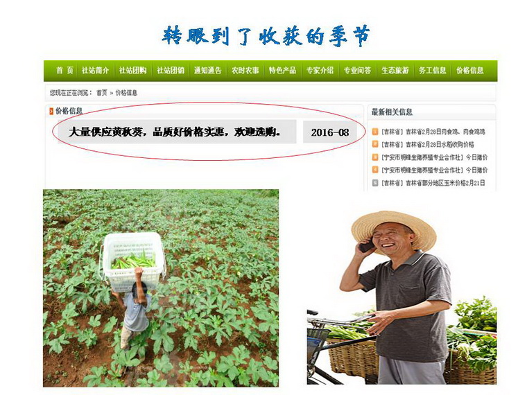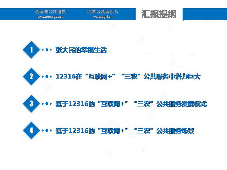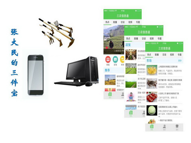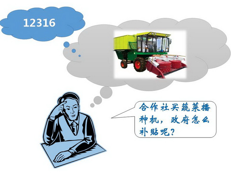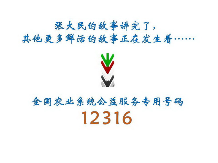 首先为大家分享一个小故事。很多年前有一部很火的电视剧,叫《张大民的幸福生活》,那个张大民是生活在城市局促空间的城里人,我们这个张大民是生活在乡村广袤田地的一位新农民,福建省漳州龙海市东园镇东园村振平蔬菜合作社的技术带头人。张大民有三件宝:锄头、手机和电脑,这些年来,锄头越用越少,手机和电脑成了主要工具。每天早上,张大民都会打开12316三农信息通这个手机软件,来获得政策、市场、气象等等最新的涉农信息。这一天,他通过“三农信息通”看到了一个有关农机补贴的新闻,这让他很感兴趣,合作社早就想买蔬菜播种机,政府怎么补贴呢?他用手机拨通了“12316”,很快就得到了专家的详细解答。去年老张打算引进新品种,在12316发布的市场信息里,发现人们越来越注重养生,黄秋葵市场需求很大,于是他引进了200亩的黄秋葵,但有天到地里一看,有不少叶片出现了褐色斑点,这让技术大拿也不知道怎么回事了。他赶紧用手机把秋葵叶片拍了下来,通过12316在线专家视频咨询系统传给了专家,果然是“强中自有强中手”,专家一下子就判断出了老张的黄秋葵得的是“叶斑病”,并给老张开出了安全有效的药方,他在网络上,找到附近的几个认证农资企业,很方便就完成了药品的定购。转眼到了收获的季节,合作社进行了线上线下多种渠道的销售,订单络绎不绝。又是一个丰收年,看着社员们喜悦的笑容,老张从心底里感到幸福,也从心底里感谢12316,感谢信息化给他带来的便捷和周到服务。张大民的故事讲完了, 其他更多鲜活的故事正在发生着……这些故事引出了我们的主题——全国农业系统公益服务专用号码12316