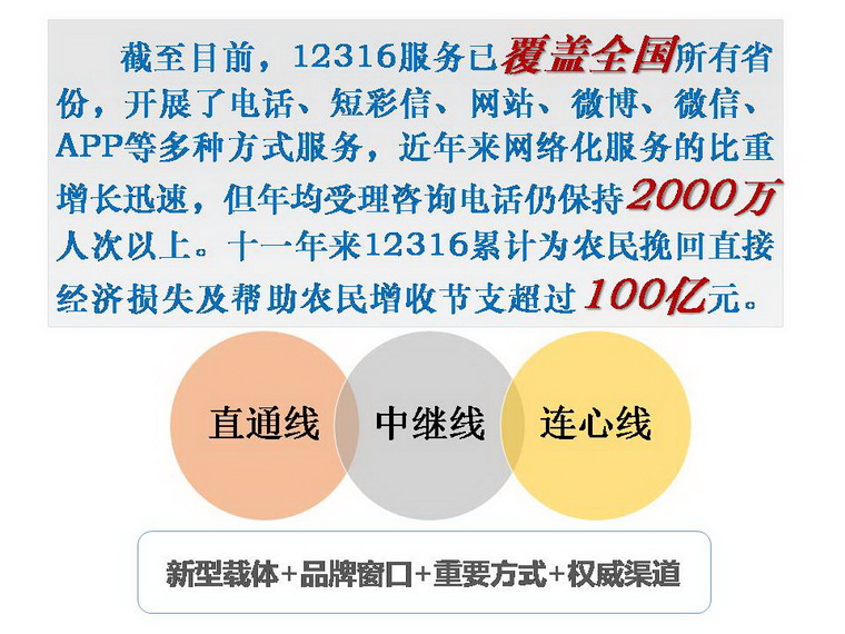 12316于2006年开通,到今年3月16日已经整整十一年。截至目前,12316服务已基本覆盖全国所有的省份,西藏的山南地区也于2014年开通,随着互联网和移动互联网的发展,短彩信、网站、移动应用、微信、微博等服务方式应用的越来越多,越来越广泛,但全国受理咨询电话仍保持在每年超过2000万人次,累计为农民挽回直接经济损失及帮助农民增收节支超过100亿元,被誉为农民和专家的直通线、农民和市场的中继线、农民和政府的连心线。