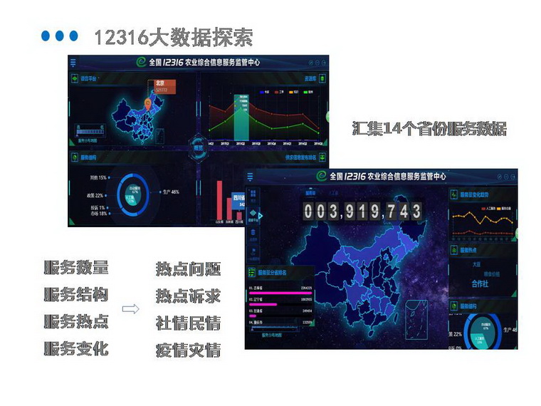 此外,基于12316积累的大量生产、销售、行为、服务等数据,中央平台正在探索大数据建设,搭建了12316监管中心,实现12316的信息资源集中共享、服务管理和数据分析。目前,该中心已经实现了14个省(区、市)咨询案例、农业知识库、农业专家库、语音服务工单等数据资源的汇聚,并初步开展了分析利用,通过服务数量、结构、变化等,及时发现当前的热点问题、热点诉求,掌握社情、民情、疫情、灾情等情况,提高工作的规划性、主动性。接下来,我们还将进一步推进部省数据对接,深入挖掘数据资源价值,为全国农业农村大数据发展和应用探索路子,积累经验,打下基础。