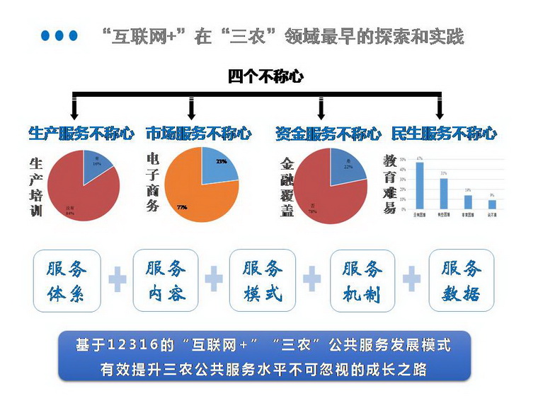 我们看到,在11年的发展过程中,12316显示出了强大的生命力,可以说,12316是互联网+在三农领域最早的探索和实践。在当前加快实现农业现代化和全面建成小康社会的重要发展阶段,12316将充分借助“互联网+”的时代浪潮,以此作为转型升级的重大机遇,以开放、合作、共享的姿态,通过互联网技术和思维进一步改造和提升12316,完善服务体系、服务内容、服务模式、服务机制和服务数据,迅速形成基于12316的互联网+三农公共服务发展模式,促进解决当前三农公共服务中存在的生产服务、市场服务、资金服务、民生服务等难题,这是有效提升三农公共服务水平不可忽视的成长之路。