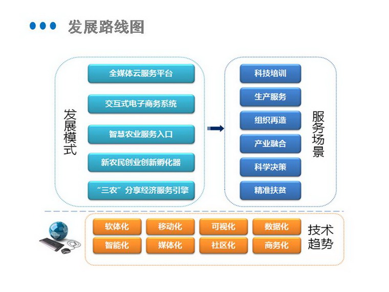 从整体发展路径上看,基于12316的“互联网+”“三农”公共服务实现纵向的升级进步和横向的创新跨越,覆盖农业商业、就业创业、文化教育、医疗卫生、便民公益、网络数据等领域,在技术发展和应用趋势方面,会体现出移动化、可视化、数据化、智能化等八个特点。在此基础上,一批具有开创性、颠覆性的业务模式将陆续诞生。