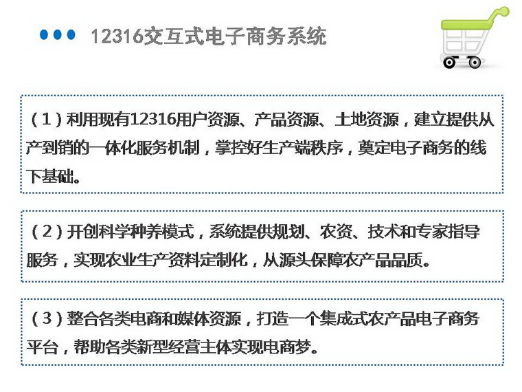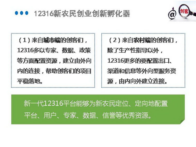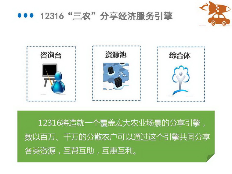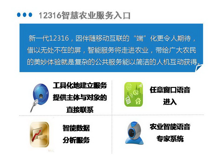 一是12316全媒体云服务平台,通过云技术、可视技术、语音技术、多媒体技术、自媒体技术等充分应用,未来的12316将不仅是一个语音台,更是一个网络广播台,一个网络电视台,完全突破目前语音平台的概念和范畴,形成视听融和一体的强大咨询服务功能;二是12316交互式电子商务系统,12316已经在生产环节紧密联系了农户,向销售端延伸也是必然,利用现有12316用户资源、产品资源、土地资源等,建立由产及销的一体化服务机制,掌控好生产端秩序,奠定电子商务线下基础,通过提供系统的专家指导服务,开创科学种养模式,从源头保障农产品品质,以12316为核心整合各类电商和媒体等服务资源,打造一个集成式平台,帮助各类新型农业经营主体实现电商梦;三是12316智慧农业服务入口,伴随移动互联的“端”,借以无处不在的屏,将复杂的公共服务以简洁的人机互动带给农民,工具化的建立各级政府以及各类服务机构与农民的直接联系,一部手机就能将政策、医疗、法律、教育、天气、价格等数据智能分析服务和专家智慧等攥在农民手中;四是12316新农民创业创新孵化器,新一代12316平台能够为新农民定位、定向地配置多种优秀资源,来自城市的创客,从专家、数据、政策等方面配置,建立由外向内的连接,来自农村的创客,更多的配置出口、渠道、信息等资源,建立由内向外的连接;五是12316三农分享经济服务引擎,12316是一个咨询台,在以此为核心构建的服务体系里,专家、教授、农技员等各种身份各个地域的人们,完全可以打破时空界限,在虚拟世界里分享真知灼见;12316是一个资源池,在服务三农过程中积累的海量信息,可以通过各种方式让远在千山万水的农民群众互相分享,互帮互助,互惠互利,一定区域内的农民,还可以通过12316分享生产性资源,比如可以给一台大型的农机具排好档期,通过12316来发布和调度,加强应用、减少冗余、节约成本;12316是一个综合体,分散在涉农机构的各类信息,可以汇集到一起,形成面向社会的开放式集约化服务,真正切实让农民少跑路,政府部门还可以通过这个综合体,掌握农民种了什么、养了什么、种了多少、长得怎么样、卖给了谁、卖了什么价,实现全程服务、精准管理和结果追踪,促进传统农业的定性向现代农业的定量进行跨越。