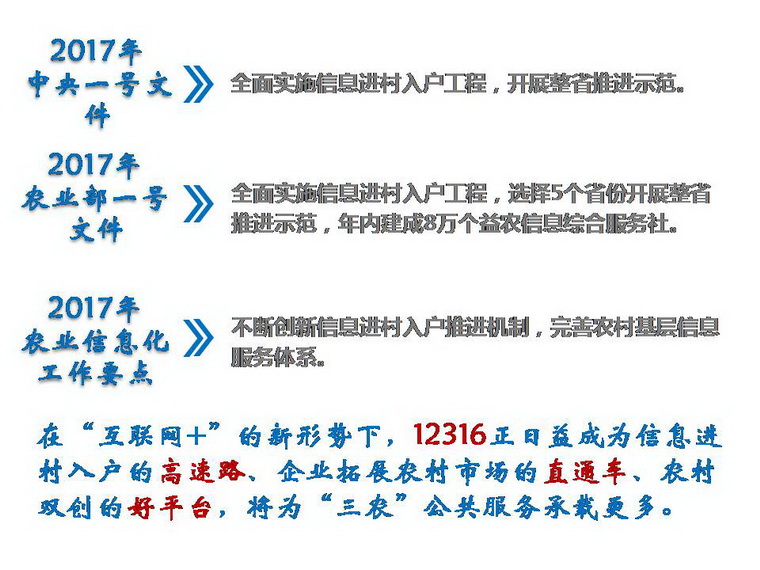2017年中央一号文件指出,要全面实施信息进村入户工程,开展整省推进示范,农业部一号文件也强调年内要建成8万个益农信息综合服务社,在农业信息化工作要点中,信息进村入户也是重要内容。在互联网+的新形势下,12316将坚持以需求和问题为导向,以变革创新为动力,更好地发挥支撑与载体作用,成为信息进村入户的“高速路”、企业拓展农村市场的“直通车”、农村双创的“好平台”,为“三农”公共服务承载更多。