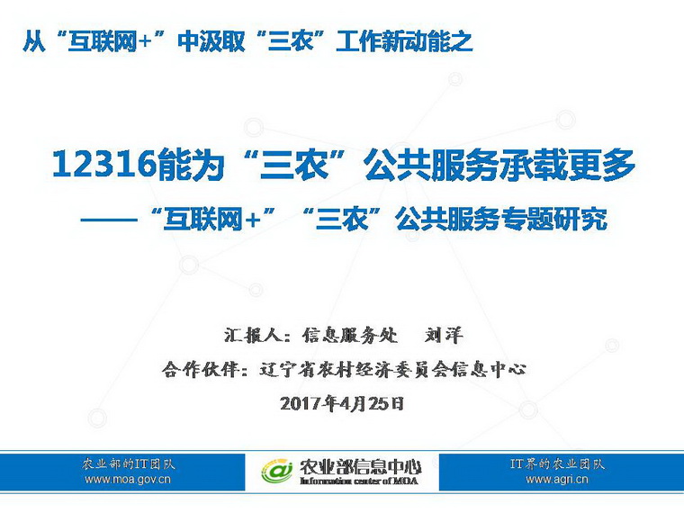 我是信息中心信息服务处刘洋,自2011年加入信息中心以来,我一直在从事技术服务和信息服务工作,今天很荣幸有这个机会向大家汇报在服务过程中的体会和思考。我的题目是“互联网+”“三农”公共服务研究,“12316能为‘三农’公共服务承载更多”。