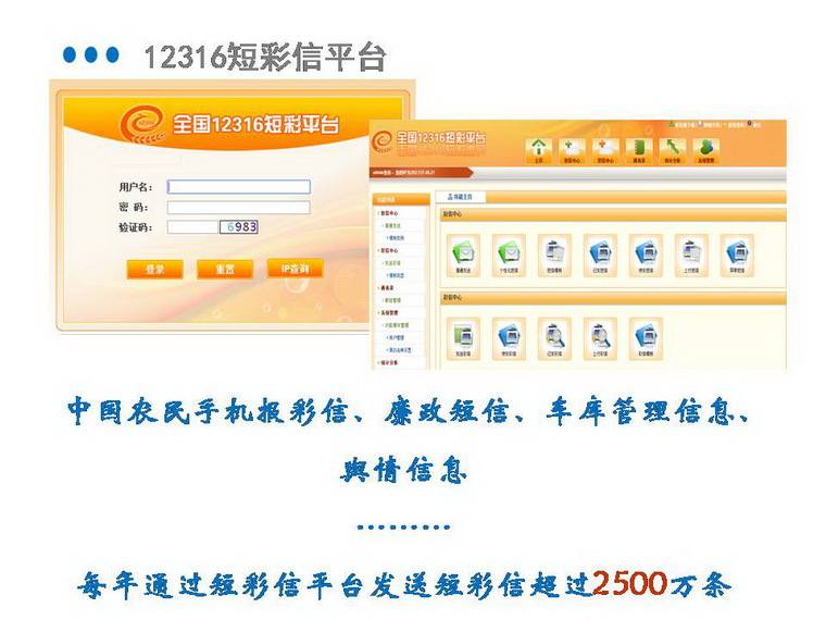 12316向我们部机关与直属单位最直接服务的,就是12316短彩信中央平台,在座的领导和同事们应该很多都收到过中国农民手机报彩信、廉政短信、舆情信息,还有车库管理相关信息,这些都是通过12316短彩信平台发送的。目前平台每年发送通知、预警、政策、市场等各类信息超过2500万条,为业务工作开展、服务方式转变提供了便捷通道与有效支撑。