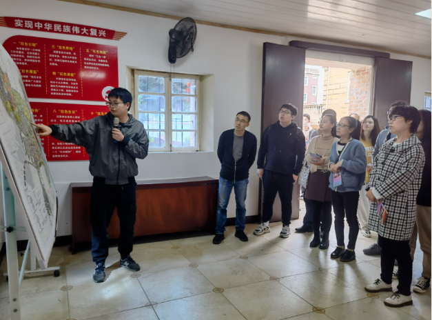 薛祎昉(左一)向调研团队介绍南宵村情况。受访者供图