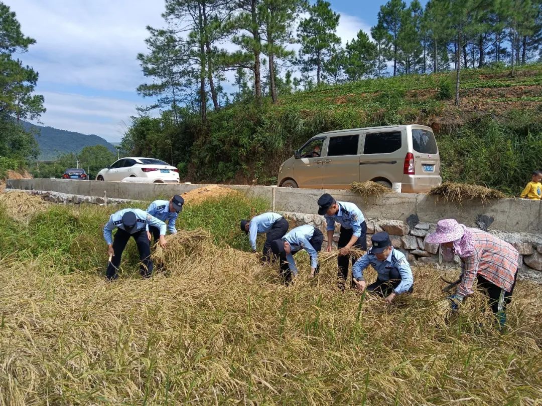 当下,正是秋收稻谷农忙季节。为了有效解决群众面临的农忙难题,在确保不影响日常执勤工作的情况下,10月24日,那梭边境检查站党支部积极作为,组织警力深入田间地头为群众排忧解难,帮助劳动力紧张的群众家庭收割稻谷。 稻田里,民、辅警一边娴熟地用镰刀收割稻谷、帮忙搬运,一边与群众拉家常、问冷暖,了解群众对检查站工作的看法,聆听他们的心声,以便对当前的工作做出针对性调整,切实做好身边事、服务好身边人,以实际行动拉进警民之间的联系。