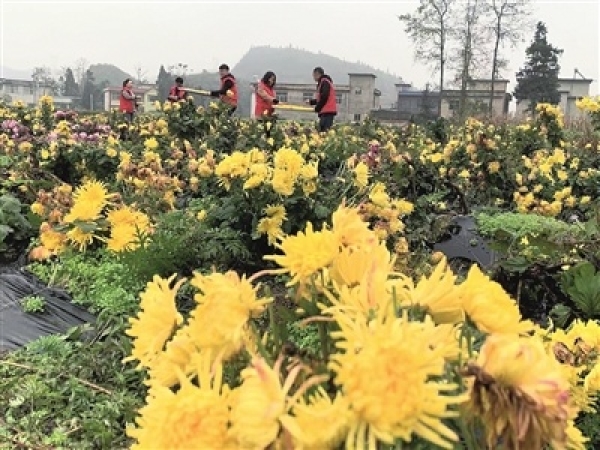 近日,记者走进龙昌镇枫香树村菊花种植基地,集中连片的菊花竞相绽放,犹如漫天繁星,灿烂盛开。村民穿梭在花海之中,或采摘菊花,或装筐搬运,勾勒出一幅美丽的丰收画卷。