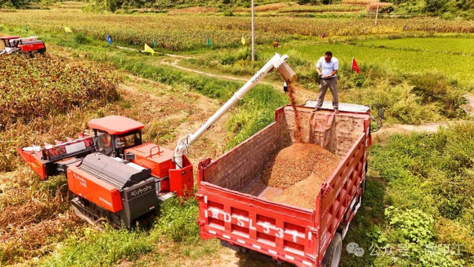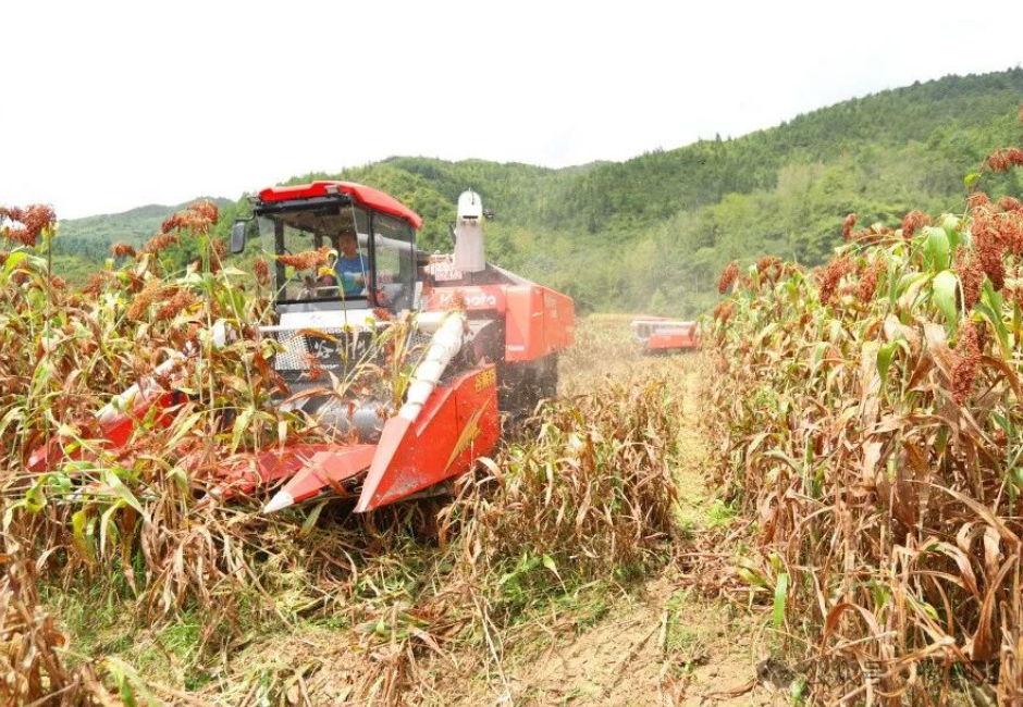 在位于梵净山西的印江自治县木黄镇坪洞口村,1200亩红缨子高粱基地里,两台收割机在田间来回穿梭作业,将一株株高粱连秆带穗卷入其中,收割、摘穗、脱粒、秸秆粉碎、装车,一气呵成。