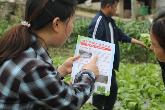 陈家秀向农户发放宣传资料,并讲解蔬菜防洪抗旱及病虫害防治知识
