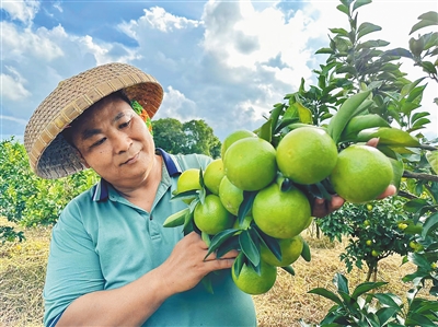 游客王春花穿梭于林间,仔细挑选着自己最满意的“作品”;在果园担任向导的农场工作人员则向前来采摘的游客分发工具、介绍选果技巧。各司其职,繁忙的场景构成了这个季节澄迈独有的美好景色。
