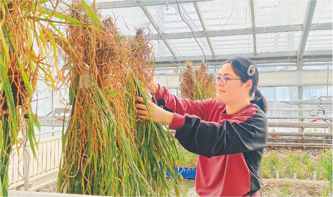 此次温室内收获的40余个小麦品系,便是“冷”“热”加代技术的成果结晶。李文雅介绍,这些小麦是去年5月杂交、加代获得的冬小麦新品系。“小麦变黄只是自然衰老的表现,现在收获的小麦外观虽绿,但籽粒其实已经成熟,能够提取有效结果了。”她解释道。收获后将其倒挂于温室内,能让根茎里残留的营养回流到籽粒中,促进籽粒进一步成熟。后续,科研人员会对小麦进行烘干、考种,再安排复种。