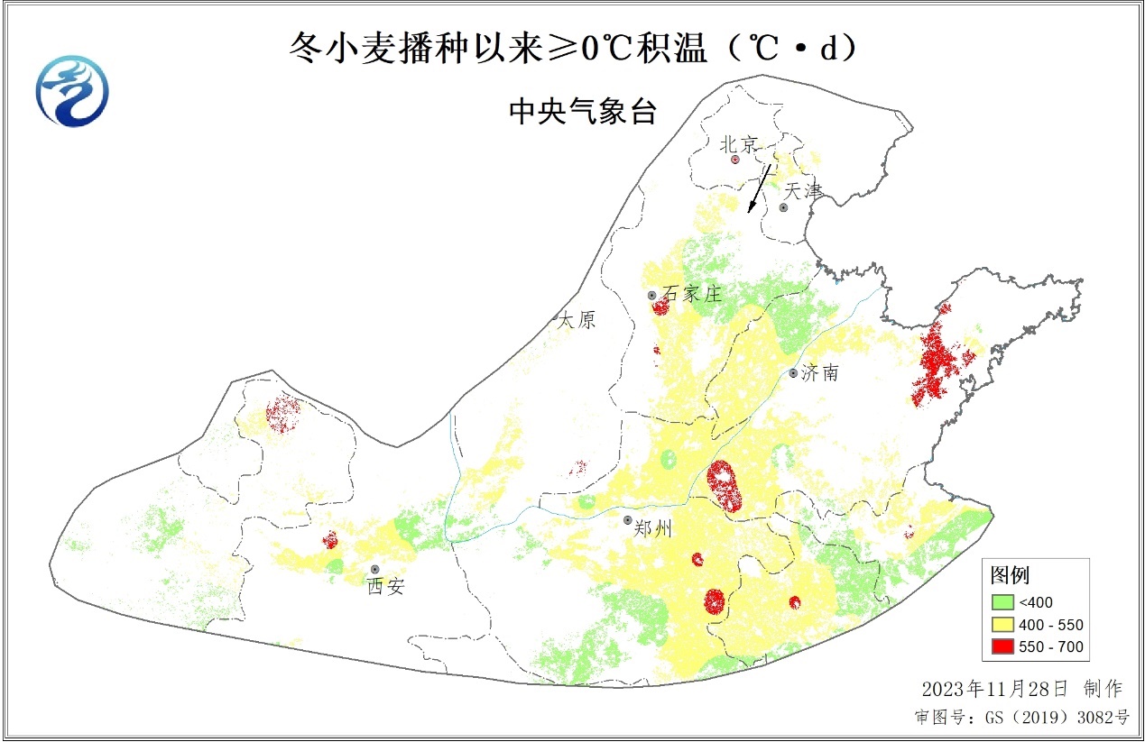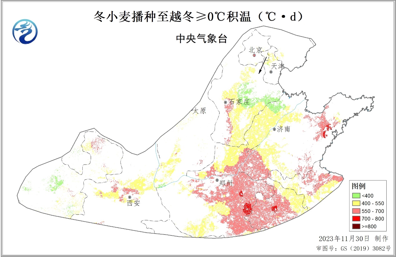 截至11月29日,北方冬麦区播种以来≥0℃积温大部在550℃˙d以下(图2),尚未达到冬小麦壮苗标准(550~700℃˙d)。其中,河北中部和南部、山东大部、河南北部和东部、皖北中西部、陕西关中西部等地积温在400~550℃˙d,达到基本越冬标准;河北东部、山东东北部、河南西南部、陕西关中东部、山西西南部及甘肃陇中等地≥0℃积温不足400℃˙d,未达到冬小麦最低越冬标准。