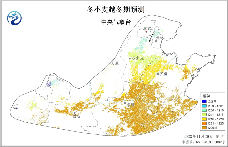 根据未来十天和12月气候预测,北方冬麦区大部气温仍维持有起伏、总体偏高的态势,利于小麦冬前分蘖生长,形成壮苗。结合冬小麦越冬指标与未来天气,预计河北小麦将在12月上旬至中旬由北向南陆续停长进入越冬期;山西主产麦区将于12月下半月开始陆续越冬;山东北部于12月中旬陆续越冬;山东东部和南部、河南大部、苏皖北部以及陕西关中平原等地将于12月下旬末由北向南逐步越冬(图4)。预计冬季气温偏高,黄淮南部部分地区可能出现带绿越冬的情况。