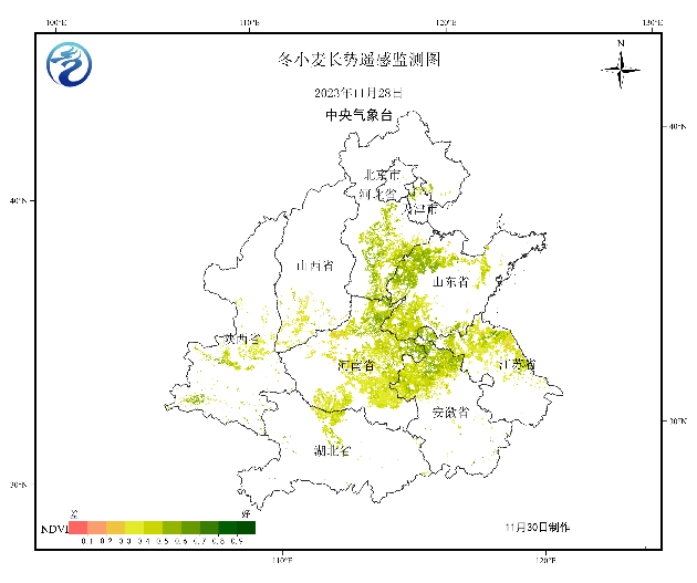 秋播(10月)以来,北方冬麦区气温接近常年到偏高1~2℃,光照正常偏多3~5成,降水量普遍有25~100毫米,大部墒情适宜,利于冬小麦冬前生长,但由于播期拉长,存在部分早播小麦旺长和晚播小麦偏弱、苗情不均衡的情况。其中,11月出现多次冷空气过程,气温波动下降,由前期持续明显偏高转为正常或阶段性偏低,利于抑制部分冬小麦旺长和大部冬小麦抗寒锻炼,对部分晚弱小麦苗情转化升级略有不利,总体来说利大于弊。