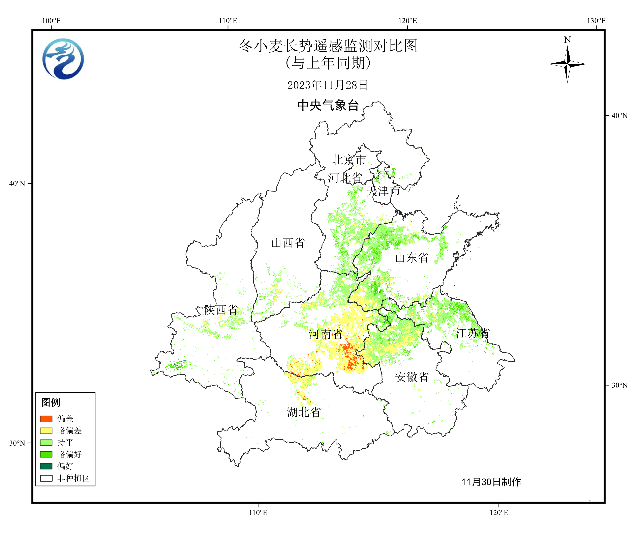 图3 主产省冬小麦长势监测(左:与上年同期对比;右:当前苗情)