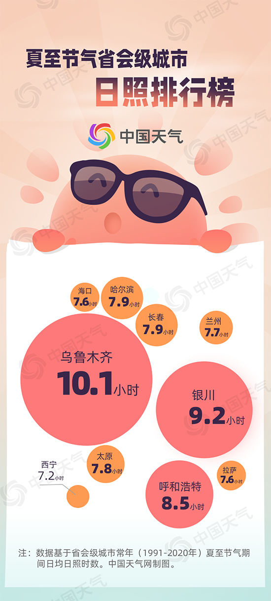 夏至日,太阳直射北回归线。中国天气网统计了常年夏至节气省会级城市日照时数排行榜,乌鲁木齐、银川、呼和浩特分居前三位,长春和哈尔滨并列第四,前十名中北方城市占据了八席。