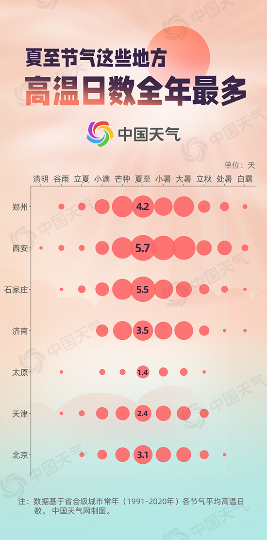 “不过夏至不热”,此时我国大部地区气温较高,尤其北方不少地方夏至节气是全年高温日最多的。据中国天气网气象分析师王伟跃介绍,华北平原此时常在大陆暖高压控制下,持续晴晒、高温频繁。据统计,夏至节气是北京、天津、石家庄、西安、太原、郑州、济南全年中高温日数最多的时段,其中西安最多,达5.7天,其次是石家庄,达5.5天。