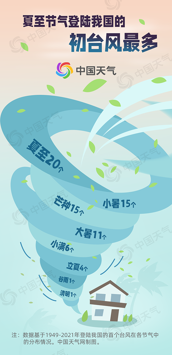 6月,我国进入台风季,而夏至的6月下旬,也是初台风(该年度首个登陆我国的台风)最扎堆的时节。中国天气网盘点了1949年至2021年的初台风数据,发现我国的初台风登陆时间主要集中在夏至到大暑节气,其中夏至最多,达20个,占比为27%;最早的初台风出现在清明节气,最晚则是在立秋节气。
