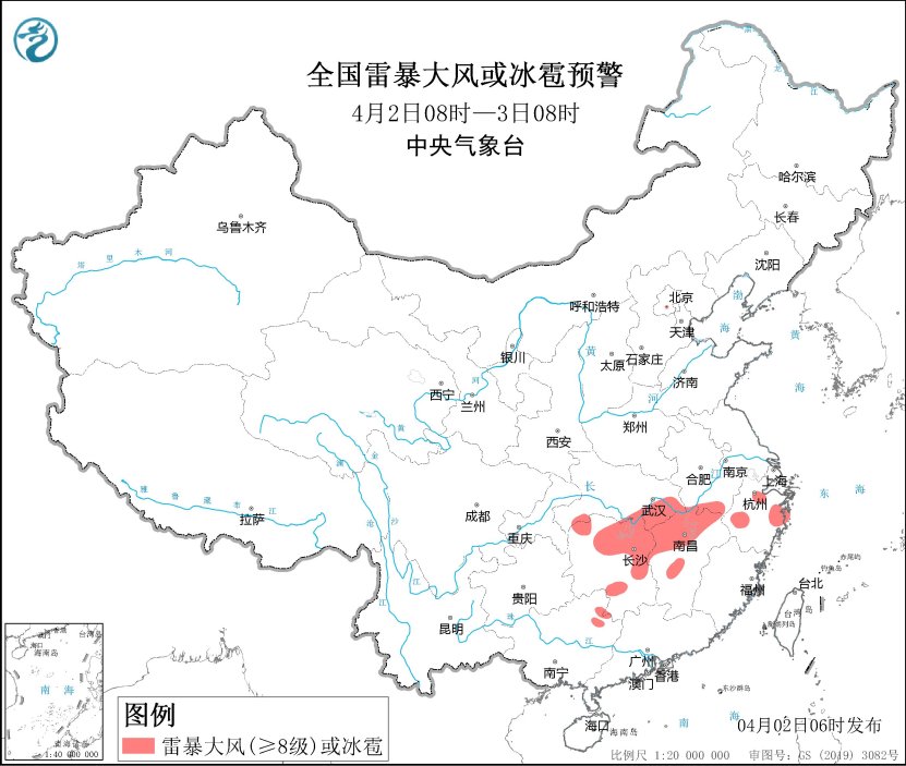预计,4月2日08时至3日08时,湖北大部、河南南部、安徽南部、江苏南部、上海北部、湖南东北部、江西北部、浙江西北部等地部分地区有大到暴雨,其中,湖北东南部、湖南东北部、安徽东南部、江西东北部等地局地有大暴雨(100~150毫米)(见图1);湖北南部、湖南中北部、江西中北部、浙江中东部、广西东北部等地的部分地区将有8-10级雷暴大风或冰雹天气,局地风力可达11级以上,冰雹直径可达2厘米;安徽中南部、江苏南部、上海北部、湖北东部和南部、湖南中北部、江西中北部、浙江西部和北部、福建西北部、重庆中东部、贵州东部、广西东北部等地的部分地区将有短时强降水天气,最大小时雨量30-50毫米,局地可达70毫米以上。预计,强对流的主要影响时段为今天午后至夜间(见图2)。中央气象台4月2日06时继续发布暴雨蓝色预警和强对流天气黄色预警。