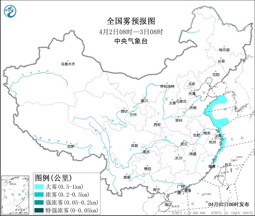 预计,4月2日白天,黄海中西部海域、山东半岛东部和南部沿岸海域、浙江沿岸海域将有能见度不足1公里的大雾。此外,4月2日傍晚至3日早晨,黄海西南部海域、江苏中部和南部沿岸海域、长江口附近海域、杭州湾附近海域、浙江中北部沿岸海域将有能见度不足1公里的大雾(见图3)。中央气象台4月2日06时继续发布大雾黄色预警。