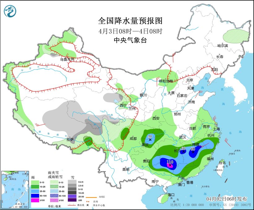 4月3日08时至4日08时,新疆北疆北部和伊犁河谷沿天山一带、西藏北部、青海东北部和南部、甘肃河西、川西高原北部、黑龙江东部等地部分地区有小到中雪或雨夹雪。江南中南部、西南地区东北部、华南北部等地部分地区有中到大雨,其中,湖南西南部、江西中部、广西东北部、广东西北部等地部分地区有暴雨或大暴雨(100~110毫米)。内蒙古河套地区和中部、新疆沿天山地区、西藏南部等地部分地区有4~5级风(见图5)。
