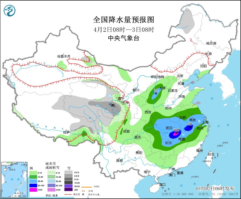 4月2日08时至3日08时,内蒙古东北部、西藏东部、甘肃河西、青海中南部、川西高原北部等地部分地区有小雪或雨夹雪,其中,西藏东南部、青海东南部、甘肃西南部等地部分地区有中到大雪(5~8毫米)。陕西东部、山西西部、黄淮南部、江淮大部、江汉、江南北部、四川盆地东部、重庆东北部等地部分地区有中到大雨,其中,湖北东南部、湖南东北部、安徽东南部、江西东北部等地部分地区有暴雨,局地大暴雨(100~150毫米)。内蒙古东北部部分地区有4~5级风(见图4)。