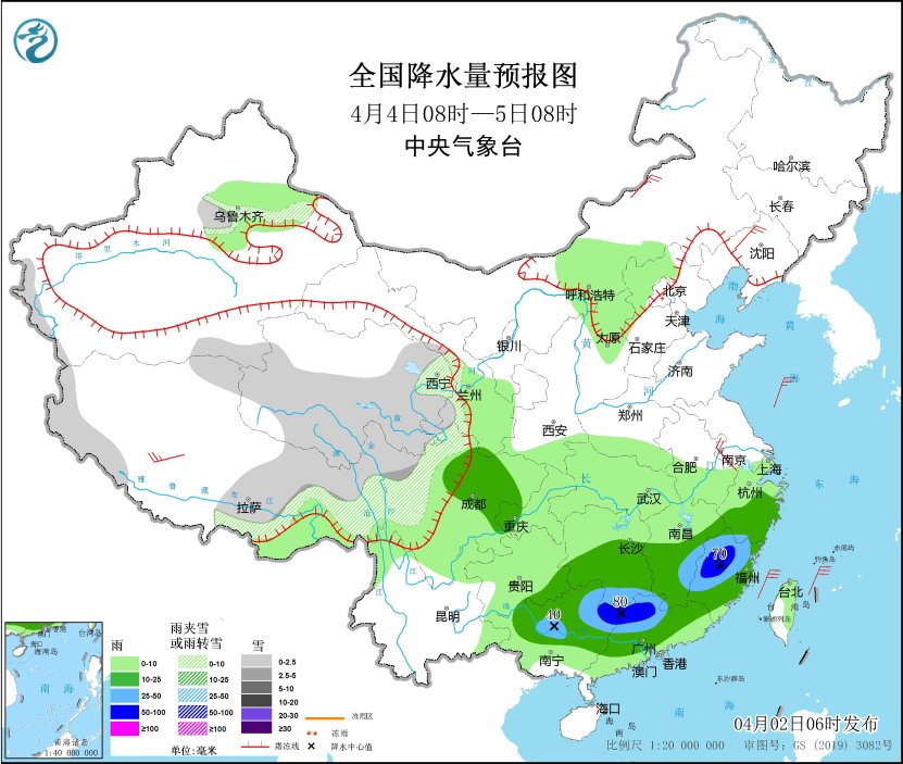 4月4日08时至5日08时,新疆沿天山地区、西藏南部和东部、青海中南部、甘肃河西、川西高原北部等地部分地区有小到中雪或雨夹雪。四川盆地大部、重庆西南部、贵州东南部、江南中南部、华南中北部等地部分地区有中到大雨,其中,福建西北部、广西东北部、广东西北部等地部分地区有暴雨(50~80毫米)。内蒙古中部、辽宁北部、西藏南部等地部分地区有4~5级风(见图6)。
