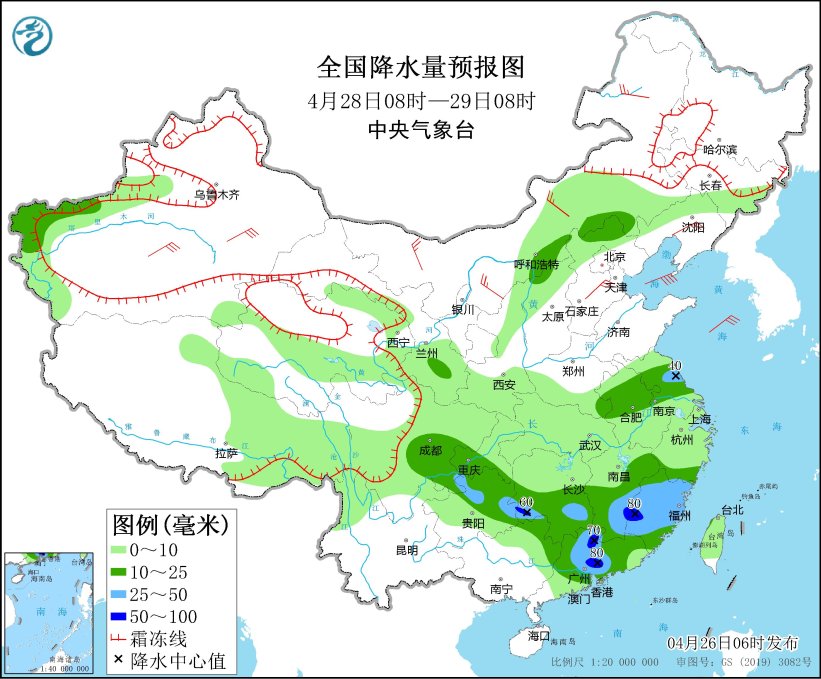 预计,4月26日08时至27日08时,福建东南部、广西中北部、广东中东部、台湾岛等地部分地区有大到暴雨,其中,广东东南部、台湾岛西部等地部分地区有大暴雨(100~180毫米)(见图1)。上述部分地区伴有短时强降水(最大小时降雨量30~50毫米,局地可超过70毫米),局地有雷暴大风或冰雹等强对流天气。中央气象台4月26日06时发布暴雨蓝色预警。