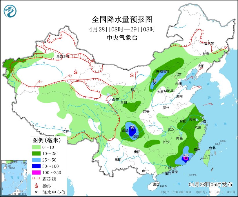 4月28日08时至29日08时,内蒙古中部、河北北部、山西北部、陕西北部、四川盆地中东部、重庆中南部、湖南西部、安徽南部、江苏中南部、江西东部、浙江西部、福建大部、广东中东部以及新疆西部等地部分地区有中到大雨,其中,四川盆地东南部、重庆西南部、广东东部、福建南部等地部分地区有暴雨到大暴雨(100~180毫米)。内蒙古大部、甘肃西部、新疆沿天山地区和南疆盆地、辽东半岛、山东半岛等地部分地区有4~6级风。新疆东部和南部、内蒙古西部、宁夏中西部、甘肃中部、青海北部等地有扬沙或浮尘天气,其中新疆南部局地有沙尘暴或强沙尘暴(见图4)。