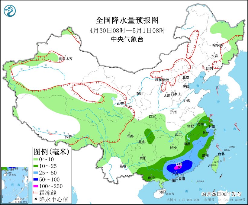 图5 全国降水量预报图(4月29日08时-30日08时)
