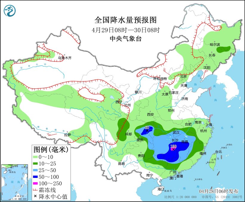 图4 全国降水量预报图(4月28日08时-29日08时)