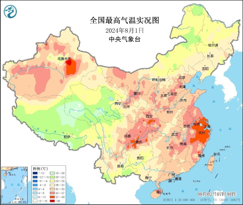 昨日,云南、贵州、广西、江苏、辽宁等地出现分散性强降雨,江淮、江南中东部、四川盆地、西北地区东部、华北及新疆等地出现高温天气,其中上海经历今年以来最热一天,浦东站气温达到40℃。预计未来三天,全国总体形势北雨南晴,华北、东北等地降雨频繁,而以江浙沪为代表的南方地区将持续面临高温“烤验”,局地气温可超过40℃,中央气象台今晨继续发布高温黄色预警。