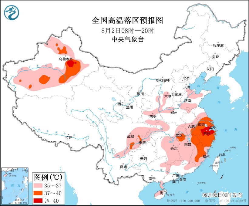 今天白天,江淮、江南大部、华南北部、四川盆地东部、重庆、陕西中南部、山西中部和西南部、河南西北部、山东北部和南部以及新疆北部、南疆盆地、吐鲁番盆地等地有35℃以上高温天气,其中,安徽南部、江苏南部、上海、湖北东南部、江西东北部、浙江、福建中北部、四川盆地东南部、重庆西部及新疆等地的部分地区最高气温37~39℃,局地可达40℃以上。