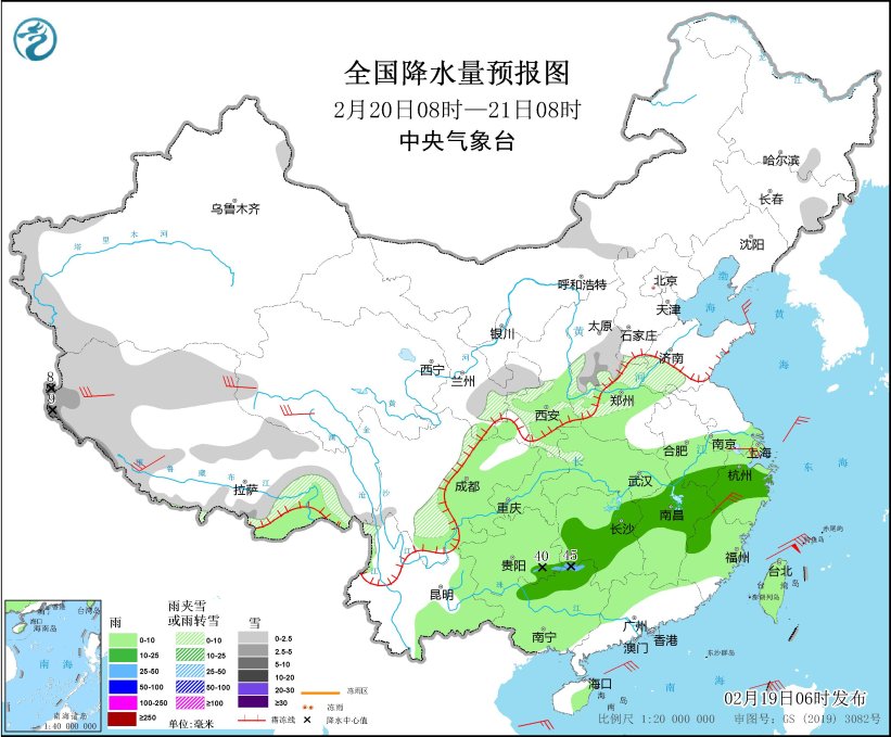 图1 全国降水量预报图(2月19日08时-20日08时)