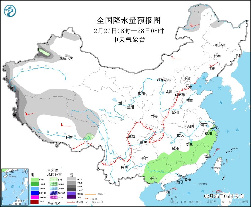 图1 全国降水量预报图(2月26日08时-27日08时)