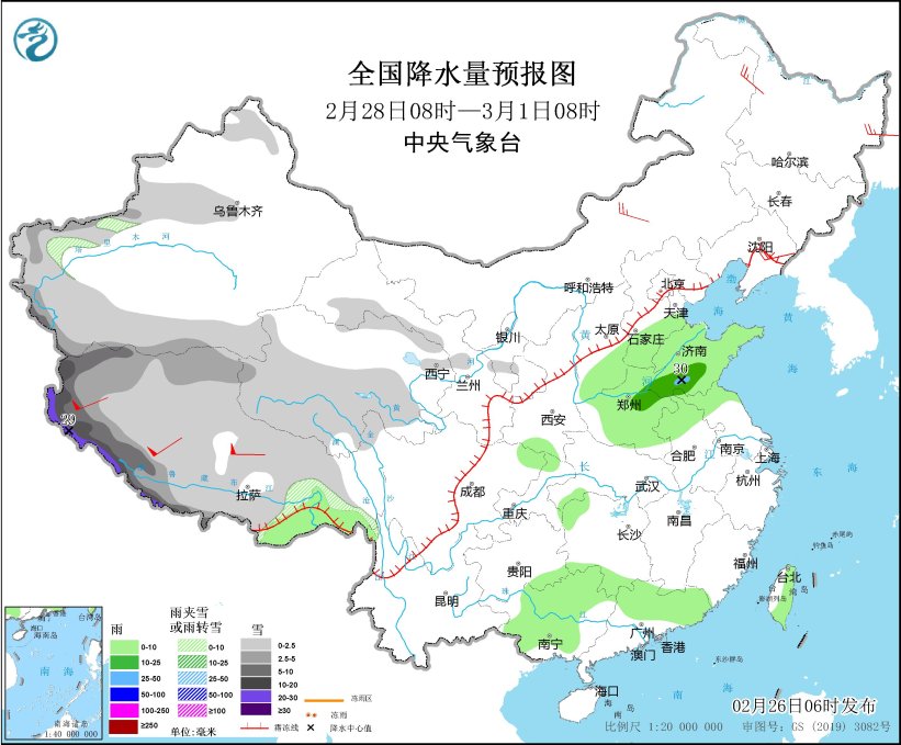 2月28日08时至3月1日08时,新疆南疆盆地和北部、西藏大部、西北地区中部等地部分地区有小到中雪或雨夹雪,其中,西藏南部和西部等地部分地区有大到暴雪,局地大暴雪(20~29毫米)。西藏东南部、华北南部、黄淮、江淮西部、华南北部和西部、台湾岛等地部分地区有小到中雨,其中,山东南部等地部分地区有大雨(25~30毫米)。内蒙古东北部和中部、黑龙江东北部、辽宁东部等地部分地区有4~6级风,其中,西藏北部和南部等地部分地区有7~8级风(见图3)。